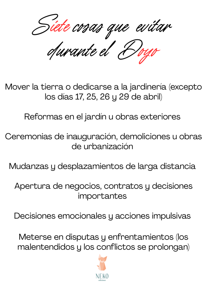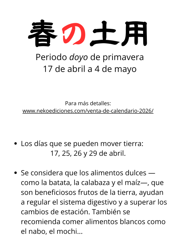 El período doyo de primavera de 2026 abarca 18 días, desde el sábado 17 de abril hasta el martes 4 de mayo. Para atravesar este período de manera eficaz, es especialmente importante prestar atención al cuidado de la condición física y a la gestión del tiempo. Dado que la energía tiende a volverse inestable durante el período doyo, se considera beneficioso tener en cuenta lo siguiente: